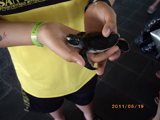 吃飽喝足也笑夠了後, 搭船前往寧靜海島, 上岸後, 轉乘古董敞篷車穿過原生叢林. 環海道兩旁美麗海景叫人心胸舒暢, 徐徐海風讓人心曠人怡. 上岸後第一站先參觀海龜保育孵化中心, 跟海龜(玳瑁)寶寶一起照相, 牠們長得好可愛喔, 真想偷偷塞幾隻到背包裡, 帶回台灣跟豆豆還有飛飛玩龜兔賽跑. 從海龜中心離開後, 停在一個看起來很像廢墟的地方, 一旁有人在賣著奇怪的乾貨, 我原本以為是蜥蝪尾巴, 一問才知道是魟魚尾巴, 總之看起來很恐怖就對了. 一旁就是接著要參觀的地方 -- 十三世紀的寧靜海古廟 Sakenan, 據說, 在巴里島過年的庫庫寧岡日, 全國各地的教徒搭船至此參加連續三天的宗教儀式, 是巴里島印度教徒的朝聖地. 我才一踏進去就覺得不對勁, 轉頭問領隊 "這是廟嗎?", 她說對, 啥? 不是跟妳說過我們不進廟嗎? 也沒說一聲, 還好小葆還沒走進去, 我趕緊衝出來阻止小葆, 剛好我們的遊覽車也繞過來要接我們了, 司機讓我們上車吹冷氣等大家.